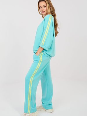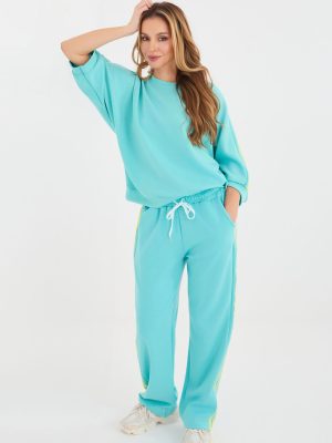 Γυναικείο σετ φόρμας που αποτελείται από μπλούζα και παντελόνι, ιδανικό για καθημερινές casual στυλιστικές επιλογές. Το λείο σχέδιο καθιστά το σετ ευέλικτο και εύκολο να προσαρμοστεί σε διάφορες περιστάσεις, από τις βόλτες, τις αγορές έως την χαλάρωση στο σπίτι. Το σετ έχει κατασκευαστεί από ένα ευχάριστο μείγμα πολυεστέρα, βισκόζης και ελαστάνης. Το υλικό τύπου “βούτυρο” είναι εξαιρετικά μαλακό, απαλό και ιδιαίτερα ευχάριστο στην επαφή, προσφέροντας έτσι υψηλή άνεση κατά την χρήση καθώς και ελευθερία κινήσεων. Το παντελόνι έχει ψηλή μέση και μακριά, ίσια πόδια που εφαρμόζουν καλά στη σιλουέτα. Στη μέση υπάρχει πρακτικός κορδόνι που επιτρέπει την προσαρμογή στη σιλουέτα. Το μοντέλο διαθέτει επίσης άνετες, πλαινές τσέπες που εισέρχονται. Η μπλούζα με μανίκι μέχρι τον αγκώνα, συμπληρώνει άριστα το σύνολο του σετ. Ένα επιπλέον διακοσμητικό στοιχείο είναι οι μοντέρνοι ρίγες που διατρέχουν τα μανίκια και τα παντελόνια, προσδίδοντας στο σετ έναν αθλητικό και μοντέρνο χαρακτήρα.