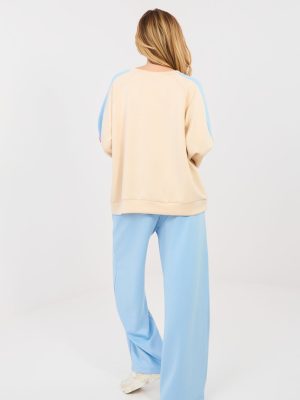 Μοντέρνο γυναικείο σύνολο φόρμας που αποτελείται από μια μπλούζα και ένα παντελόνι, διατηρώντας έναν καζουαλ στιλ, ιδανικό για καθημερινή χρήση. Θα λειτουργήσει άψογα κατά τη διάρκεια καθημερινών δραστηριοτήτων, περιπάτων ή χαλάρωσης στην οικιακή άνεση. Κατασκευασμένο από μείγμα υψηλής ποιότητας πολυεστέρα, βισκόζης και ελαστάνης, που εξασφαλίζει άνεση, ελαστικότητα και καλή εφαρμογή στο σχήμα του σώματος. Η μπλούζα με μακριά μανίκια και κλασικό, στρογγυλό λαιμόκοψη είναι διακοσμημένη με κείμενο στο μπροστινό μέρος, δίνοντας σε όλο το σύνολο έναν μοντέρνο χαρακτήρα. Το παντελόνι με μακριές, φαρδιές μπατζάκια και ψηλή μέση διασφαλίζει άνεση στη φορά, ενώ οι πλαϊνές τσέπες αυξάνουν τη λειτουργικότητα. Οι ρίγες στους μανίκες της μπλούζας αποτελούν μια στυλάτη λεπτομέρεια που υπογραμμίζει την αθλητική-αστική εμφάνιση.