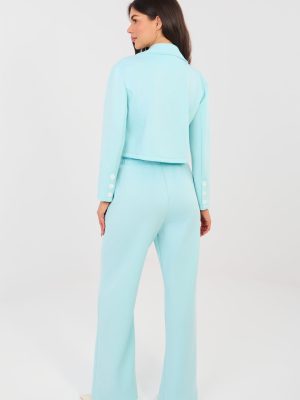 Στυλάτο σετ φόρμας: σακάκι συνδυασμένο με παντελόνι που ενώνει την κομψότητα με την καθημερινή άνεση. Ραμμένο από υλικό τύπου βούτυρο που είναι εξαιρετικά ευχάριστο στην αφή, απαλό και λείο, εξασφαλίζει μέγιστη άνεση κατά την φορά και εξαιρετική προσαρμογή στη σιλουέτα. Το σακάκι διαθέτει περαστά πέτα και γιακά, κλείνει με κουμπιά, προσδίδοντας συνολικά μοντέρνο και κατσαρικό χαρακτήρα. Το μακρύ μανίκι διακοσμημένο με κουμπιά αποτελεί μια στυλάτη λεπτομέρεια που τονίζει το καλαίσθητο φινίρισμα. Το παντελόνι έχει ψηλή μέση, μακριές, ίσιες καμπάνες και δέσιμο στη μέση που εξασφαλίζουν άνεση και ελευθερία κινήσεων. Το μοντέλο είναι εφοδιασμένο με πλάγιες, ανοιχτές τσέπες που αυξάνουν τη λειτουργικότητα του σετ. Το ομαλό σχέδιο και το προσεκτικά επιλεγμένο μείγμα πολυεστέρα, βισκόζης και ελαστάνης εξασφαλίζουν ότι το σετ θα είναι ιδανικό τόσο για καθημερινές εμφανίσεις όσο και για δουλειά σε κομψή, άνετη εκδοχή. Είναι η ιδανική πρόταση για γυναίκες που εκτιμούν το στυλ, την άνεση και την ευελιξία σε ένα και μόνο σετ.