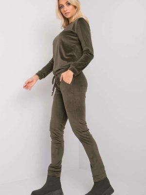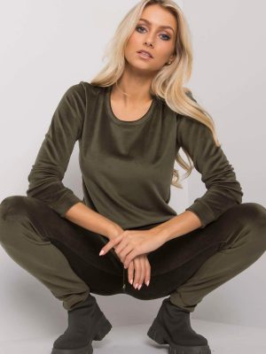 Σετ από βελούδο που αποτελείται από μπλούζα και παντελόνι. Μπλούζα με μακριά μανίκια και στρογγυλή λαιμόκοψη. Μακρύ παντελόνι με γραβάτα στη μέση και τσέπες.