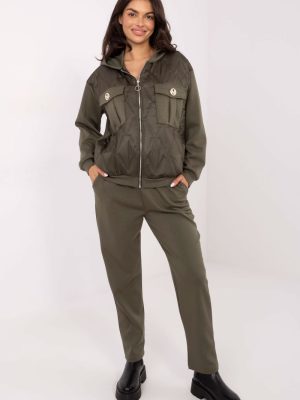 Στυλάτος συνδυασμός φόρμας που αποτελείται από φούτερ και παντελόνι, ιδανικός για καθημερινές, casual στυλιστικές επιλογές. Κατασκευασμένο από υψηλής ποιότητας βισκόζη με ποικιλόμορφη υφή, από μαλακό υλικό τύπου βούτυρο, απαλό και εξαιρετικά ευχάριστο στην αφή, που εγγυάται μέγιστη άνεση κατά την χρήση. Το φούτερ έχει μακρύ μανίκι και πρακτική κουκούλα, ενώ το μπροστινό μέρος στολίζεται με διακοσμητική πικέ ραφή, που προσδίδει στο σύνολο μοντέρνο χαρακτήρα. Το μοντέλο κλείνει με φερμουάρ, το οποίο αυξάνει την άνεση στη χρήση. Στο ύψος του στήθους υπάρχουν τσέπες με καπάκι, διακοσμημένες με κομψά μπιζού, προσθέτοντας υποδειγματική πρωτοτυπία και στυλάτο φινίρισμα. Τα παντελόνια έχουν ψηλή μέση, στενές κατά μήκος κλωστές και ραμμένη ελαστική μέση με επιπλέον σχέδιο δεσίματος, προσφέροντας τέλεια εφαρμογή και άνεση. Είναι επίσης εξοπλισμένα με πλάγιες, ενσωματωμένες τσέπες, καθιστώντας τα πρακτικά για καθημερινή χρήση. Οι γάμπες είναι μακριές, άνετες και παραμορφώνονται τέλεια στη σιλουέτα. Ο συνδυασμός εντυπωσιάζει με την άνεση, τη λειτουργικότητα και τις μοντέρνες λεπτομέρειες, ιδανικός για γυναίκες που εκτιμούν την στυλάτη εμφάνιση σε casual έκδοση.
