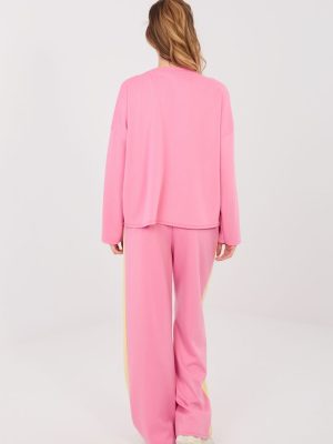 Ο στιλάτος γυναικείος σορτς σε καθημερινή έκδοση είναι μια ιδανική πρόταση για κάθε μέρα. Ο συνδυασμός άνεσης με μοδάτες λεπτομέρειες καθιστά το σύνολο ιδανικό για καθημερινές δραστηριότητες, περιπάτους ή συναντήσεις σε ελεύθερο στυλ. Το σύνολο αποτελείται από ένα μπλουζάκι με μακρύ μανίκα και κλασικό, στρογγυλό ντεκολτέ, καθώς και από μακριά παντελόνια με φαρδιές ρεβέρ. Το ομοιόμορφο σχέδιο τονίζει τον универсαλισμό του συνόλου, καθιστώντας το εύκολο να συνδυαστεί με διαφορετικά αξεσουάρ. Η μπλούζα είναι διακοσμημένη με μια εντυπωσιακή αντίθεση κορδέλα στο μπροστινό μέρος, που προσθέτει μια θηλυκή και διακριτικά κομψή αίσθηση στο σύνολο. Τα παντελόνια με ψηλή μέση ελκυστικά σμιλεύουν τη μέση, ενώ η ελαστική ταινία στην μέση εξασφαλίζει άνετη εφαρμογή στο σχήμα του σώματος. Ένα επιπλέον πλεονέκτημα είναι οι πρακτικές πλάγιες τσέπες και οι λωρίδες που τρέχουν κατά μήκος των ποδιών, που προσδίδουν αθλητικό χαρακτήρα και οπτικά λεπταίνουν τα πόδια. Το σύνολο είναι φτιαγμένο από ευχάριστο στην αφή μείγμα πολυεστέρα, βισκόζης και ελαστάνης – το υλικό είναι μαλακό, ελαστικό και ανθεκτικό στις τσακίσεις, διασφαλίζοντας άνεση κατά τη διάρκεια όλων των ημερών. Αυτή είναι μια άνετη και θηλυκή συλλογή που συνδυάζει την αθλητική ελευθερία με τις μοντέρνες λεπτομέρειες.