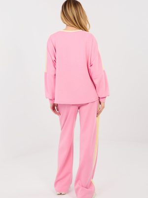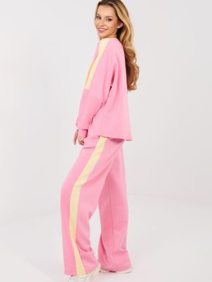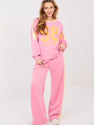 Η γυναικεία φόρμα που αποτελείται από φούτερ και παντελόνι είναι μια άνετη και στιλάτη πρόταση για καθημερινές ρούχες σε casual στυλ. Το μοντέλο αυτό είναι ιδανικό για καθημερινή χρήση, καθώς και για βόλτες ή χαλάρωση, συνδυάζοντας τη μοντέρνα εμφάνιση με τη μέγιστη άνεση κατά την διάρκεια της χρήσης. Οι διακοσμητικές επιγραφές και οι αριθμοί τοποθετημένοι μπροστά στο φούτερ και στα μανίκια προσθέτουν στον συνολικό στυλ έναν αθλητικό και σύγχρονο χαρακτήρα. Η φόρμα είναι κατασκευασμένη από υψηλής ποιότητας μείγμα πολυεστέρα, βισκόζης και ελαστάνης, που εξασφαλίζει απαλότητα, ελαστικότητα και καλή εφαρμογή στο σώμα. Το φούτερ διαθέτει μακριά μανίκια και κλασικό, στρογγυλό λαιμόκοψι. Τα παντελόνια με μακριές, φαρδιές πιέτες και ψηλή μέση εγγυώνται άνεση καθώς και ελευθερία κινήσεων. Τα πρακτικά πλαϊνά τσέπες στις οποίες εισάγονται χέρια αυξάνουν τη λειτουργικότητα του σετ. Ένα επιπλέον πλεονέκτημα είναι οι λωρίδες στα παντελόνια και τα μανίκια που τονίζουν τον αθλητικό στυλ και οπτικά αδυνατίζουν τη σιλουέτα.