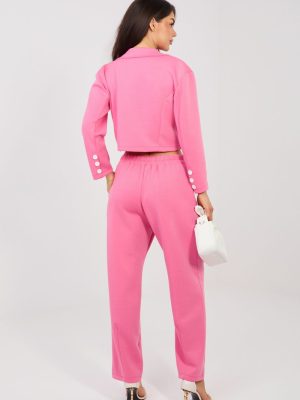 Ένα κομψό γυναικείο σύνολο που αποτελείται από ένα κοντό σακάκι και μακριά παντελόνια είναι μια εξαιρετική πρόταση για τη δουλειά και για καθημερινή χρήση. Το κλασικό, απλό σχέδιο υπογραμμίζει τον διαχρονικό χαρακτήρα του συνόλου, ενώ το προσεκτικά επιλεγμένο ύφασμα (πολυεστέρας, βισκόζη, ελαστάνη) εξασφαλίζει άνεση, ανθεκτικότητα και αισθητική εμφάνιση όλη την ημέρα. Το κοντό σακάκι με μακριά μανίκια έχει ολοκληρωθεί με πέτα, που του προσδίδουν κομψότητα και επαγγελματικό χαρακτήρα. Το διπλό κούμπωμα με κουμπιά προσθέτει elegance και διαμορφώνει διακριτικά τη σιλουέτα. Το παντελόνι με ψηλή μέση υπογραμμίζει όμορφα τη μέση, ενώ οι στενές μπατζάκια αναδεικνύουν τα πόδια. Το μοντέλο δεν διαθέτει κλασικό κούμπωμα, στο ύψος της μέσης έχει ραμμένη ελαστική ταινία στην πλάτη, που εγγυάται άνεση κατά την ενδυμασία και τέλεια εφαρμογή. Επιπλέον πλεονέκτημα είναι οι πρακτικές, πλάγιες τσέπες που είναι κρυφές. Το ύφασμα είναι μαλακό, λεπτό και εξαιρετικά ευχάριστο στην αφή. Είναι ένα καθολικό σύνολο που συνδυάζει κομψότητα με άνεση, ιδανικό για το γραφείο, για επαγγελματικές συναντήσεις και για στυλάτες καθημερινές εξόδους.
