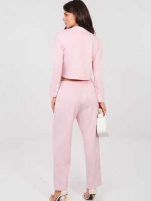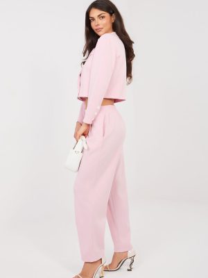 Ένα κομψό γυναικείο σύνολο που αποτελείται από ένα κοντό σακάκι και μακριά παντελόνια είναι μια εξαιρετική πρόταση για την εργασία και την καθημερινότητα. Το κλασικό, λείο σχέδιο τονίζει τον διαχρονικό χαρακτήρα του συνόλου, ενώ το προσεκτικά επιλεγμένο ύφασμα (πολυεστέρας, βισκόζη, ελαστάνη) εξασφαλίζει άνεση, ανθεκτικότητα και αισθητική εμφάνιση καθ’ όλη τη διάρκεια της ημέρας. Το κοντό σακάκι με μακριά μανίκια έχει τελειώματα με πέτα, που του προσδίδουν κομψότητα και επαγγελματικό χαρακτήρα. Η διπλή κουμπότρυπα προσθέτει κομψότητα και διαμορφώνει διακριτικά τη σιλουέτα. Τα παντελόνια με ψηλή μέση αναδεικνύουν όμορφα τη μέση, ενώ οι κοντές μανσέτες λεπταίνουν τα πόδια. Το μοντέλο χωρίς κλασική κλείσιμο, με ελαστική ζώνη ραμμένη πίσω, εγγυάται άνεση κατά τη διάρκεια της χρήσης και ιδανική εφαρμογή. Ένα επιπλέον πλεονέκτημα είναι οι πρακτικές, πλάγιες τσέπες που εισέρχονται. Το υλικό τύπου βουτύρου είναι μαλακό, απαλό και εξαιρετικά ευχάριστο στην αφή. Αυτό είναι ένα καθολικό σύνολο που συνδυάζει την κομψότητα με την άνεση, ιδανικό για το γραφείο, για επιχειρηματικές συναντήσεις καθώς και για στυλάτες, καθημερινές εξόδους.