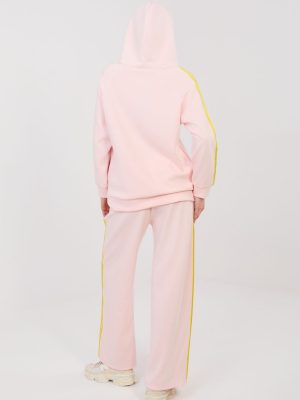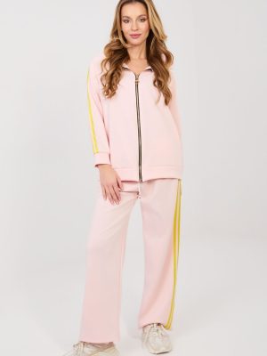 Γυναικείο σετ φόρμας αποτελούμενο από φούτερ και παντελόνι, ιδανικό για καθημερινές casual στυλιστικές επιλογές. Το απλό σχέδιο καθιστά το σετ σύγχρονο και универсální, καθιστώντας το τέλειο για βόλτα, αγορές ή χαλάρωση. Το σετ έχει κατασκευαστεί από μια άνετη και ευχάριστη στην εφαρμογή μείγμα πολυεστέρα, ελαστάνης και βισκόζης. Το υλικό είναι μαλακό, ελαστικό και προσαρμόζεται καλά στη σιλουέτα, προσφέροντας άνεση καθ’ όλη τη διάρκεια της ημέρας. Το φούτερ με μακριά μανίκια διαθέτει πρακτική κουκούλα και φερμουάρ, διευκολύνοντας την τοποθέτησή του και επιτρέποντας τη ρύθμισή του ανάλογα με τον καιρό. Ένα επιπλέον πλεονέκτημα είναι οι πλάγιες, ανοιχτές τσέπες. Τα μανίκια είναι διακοσμημένα με μοντέρνα λωρίδες που προσδίδουν αθλητικό χαρακτήρα. Τα παντελόνια έχουν ψηλή μέση και μακριά, φαρδιά πόδια που εξασφαλίζουν ελευθερία κινήσεων. Στη μέση υπάρχει ελαστική ζώνη και κορδόνι που επιτρέπει καλύτερη εφαρμογή. Οι λωρίδες στα πόδια υπογραμμίζουν το σύγχρονο, αθλητικό-casual στυλ του σετ.