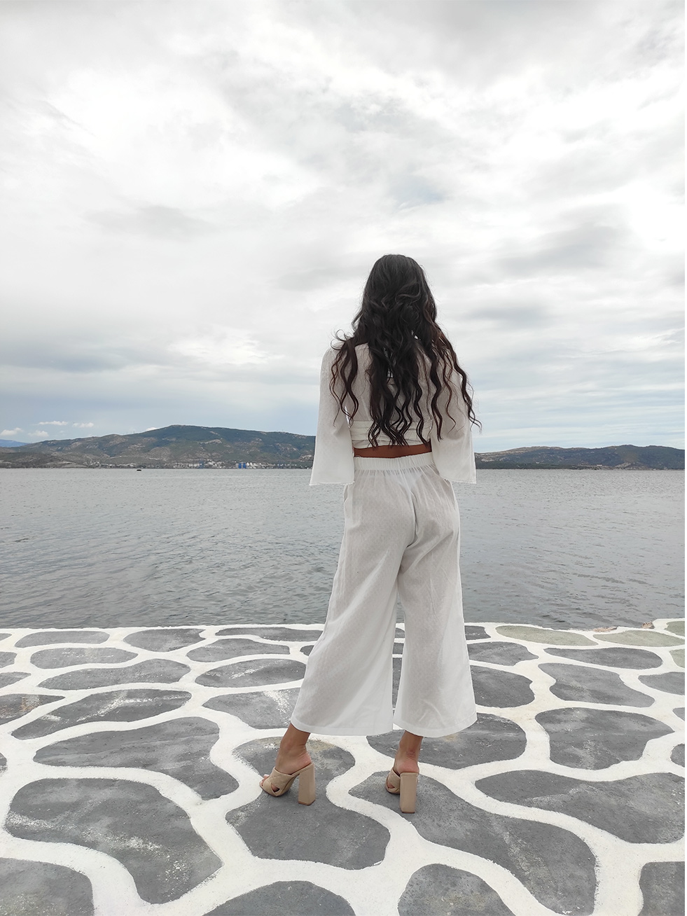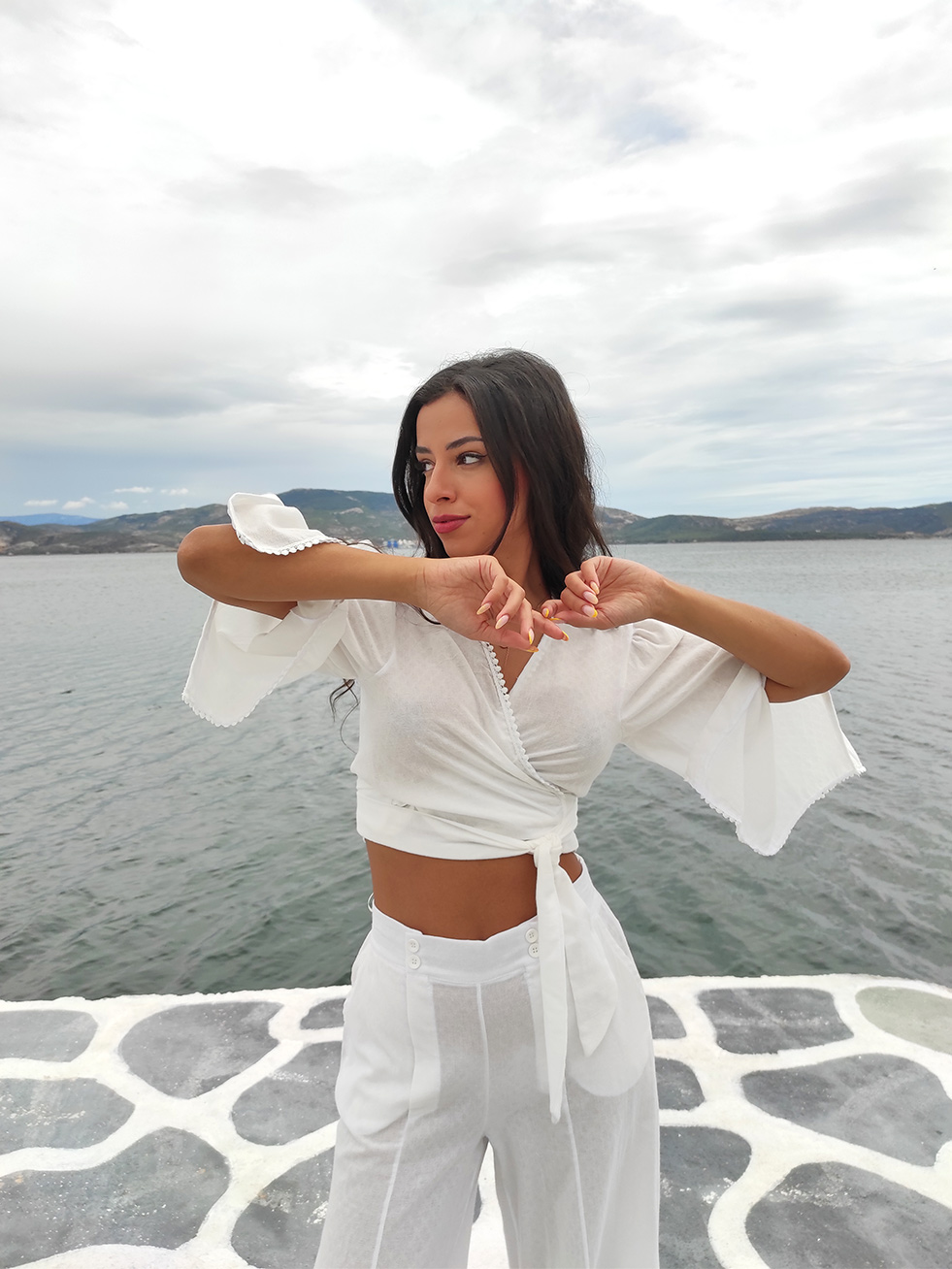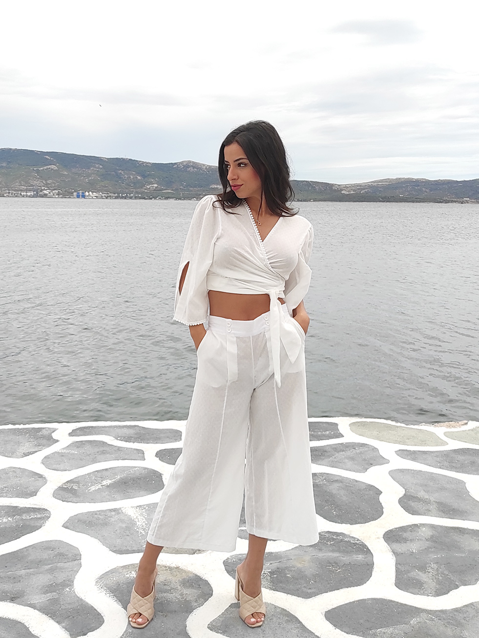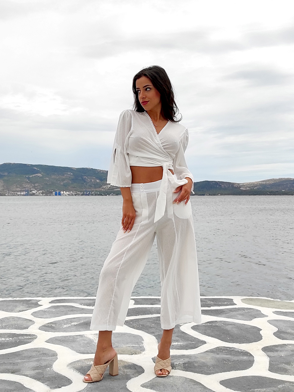 Σετ τύπου λινό σε λευκό χρώμα με τοπ δετό κρουαζέ και μανίκι 3/4 με άνοιγμα και παντελόνα σε άνετη γραμμή με λάστιχο στη μέση και διακοσμητικά κουμπιά