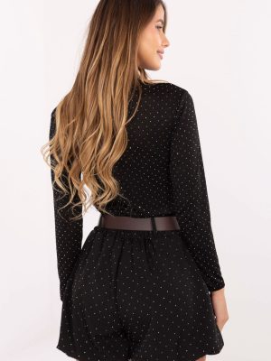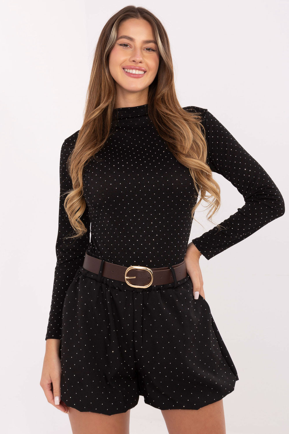 Κομψά γυναικεία σορτς από ύφασμα με ευχάριστη γραμμή, κατασκευασμένα από υψηλής ποιότητας βισκόζη με προσθήκη ελαστάνης, που προσφέρει ελαφρότητα, αερισμό και άνεση κατά την φόρεση. Το μοντέλο έχει ψηλή μέση και φαρδιές ποδιές, που αναδεικνύουν υπέροχα τη μέση και οπτικά λεπταίνουν τη σιλουέτα. Στη μέση έχει ραμμένο ελαστικό λάστιχο που εξασφαλίζει τέλεια εφαρμογή, ενώ η επιπλέον ρυθμιζόμενη ζώνη επιτρέπει την ανάδειξη της γυναικείας φιγούρας. Τα σορτς διαθέτουν πλευρικές, ανοικτές τσέπες και εσωτερική επένδυση, που αυξάνουν την άνεση χρήσης. Όλη η επιφάνεια είναι διακοσμημένη με λαμπερά στρας, που προσδίδουν μοναδικό χαρακτήρα και κομψή λάμψη. Αυτή είναι μια εξαιρετική επιλογή για περιπτώσεις επισκέψεων και πάρτι, ένα ιδανικό συνδυασμό κομψότητας, στυλ και άνεσης.