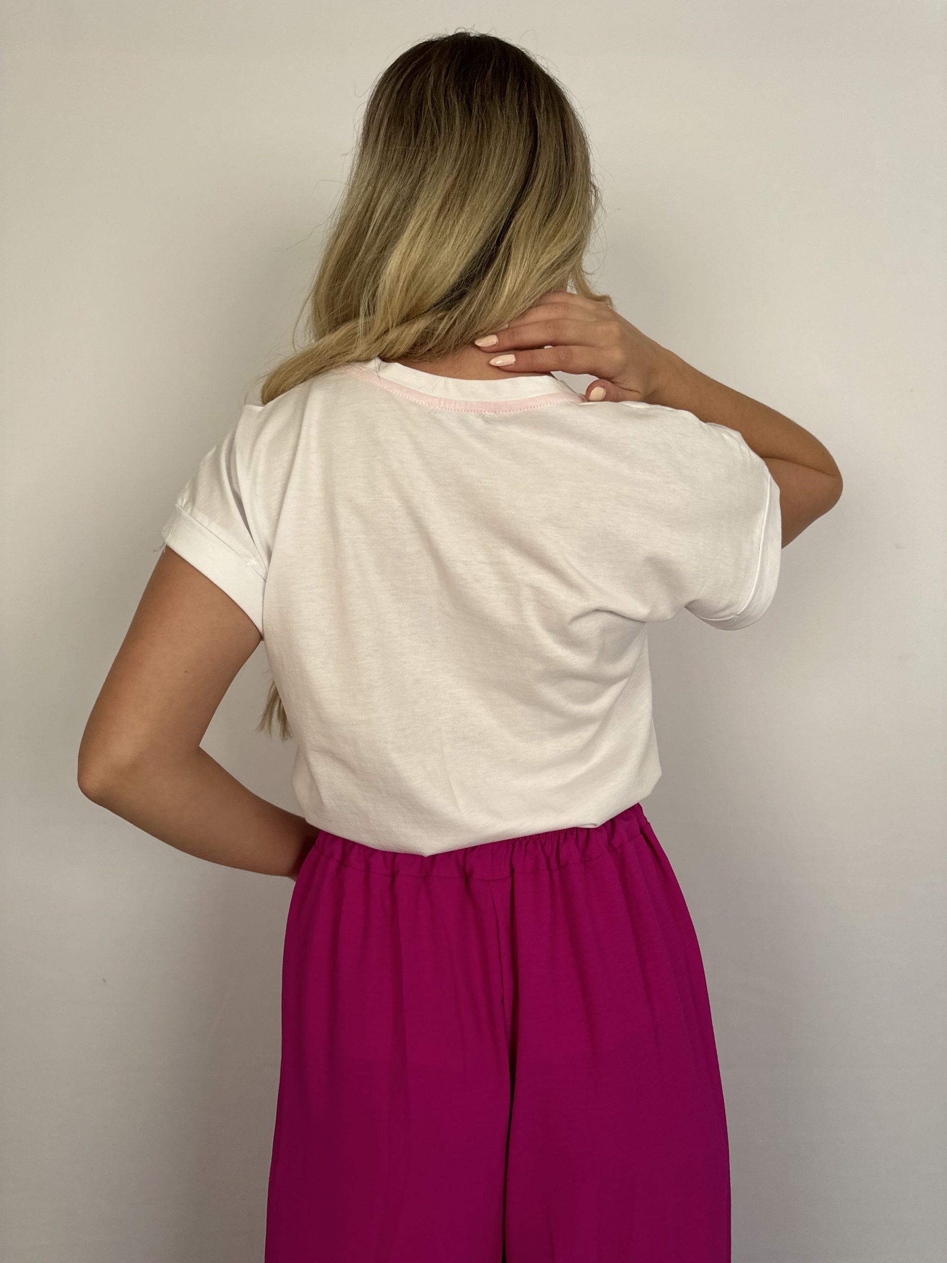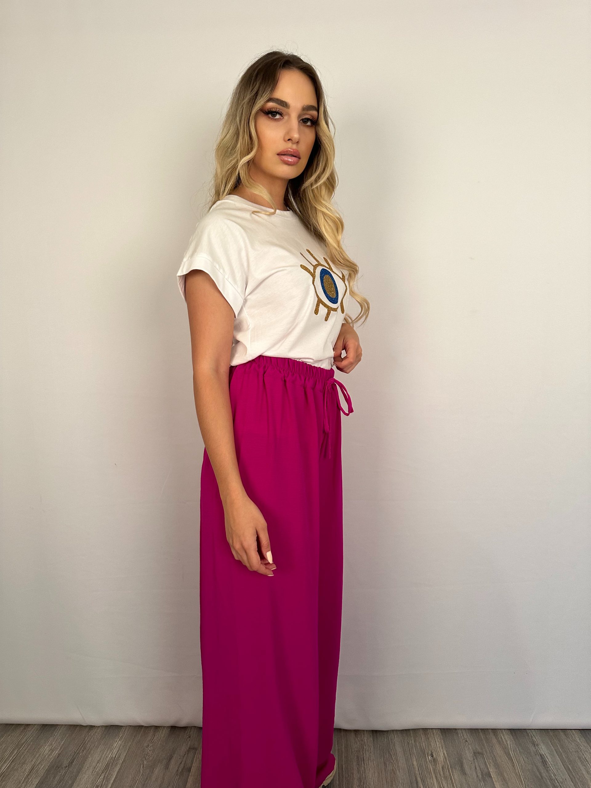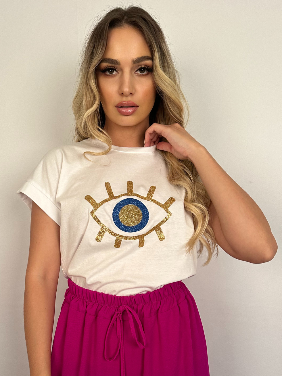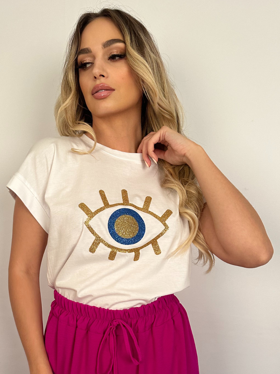 T-shirt σε λευκό χρώμα, με τύπωμα μάτι. Άνετη γραμμή.