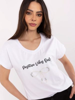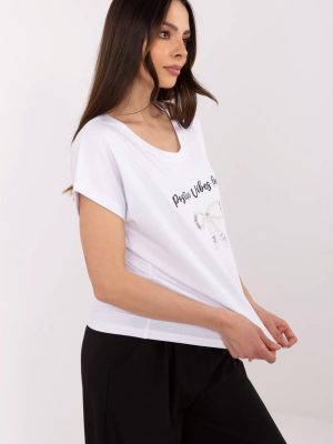 Κασual γυναικείο T-shirt που έχει σχεδιαστεί για καθημερινή άνεση και κομψή εμφάνιση. Ραμμένο από υψηλής ποιότητας βαμβάκι με προσθήκη ελαστάνης, αγκαλιάζει τέλεια τη σιλουέτα και προσφέρει άνεση όλη την ημέρα. Μοντέλο με κανονικό μήκος, κοντό μανίκι και κλασικό, στρογγυλό λαιμόκοψη. Το T-shirt είναι διακοσμημένο με εντυπωσιακή εφαρμογή και εκτύπωση, ενώ οι επιπλέον διακοσμήσεις με κρυστάλλους προσθέτουν μια διακριτική λάμψη και κομψό χαρακτήρα. Ιδανική πρόταση για καθημερινές, ελεύθερες στυλιστικές επιλογές που ξεχωρίζουν για τις λεπτομέρειες.
