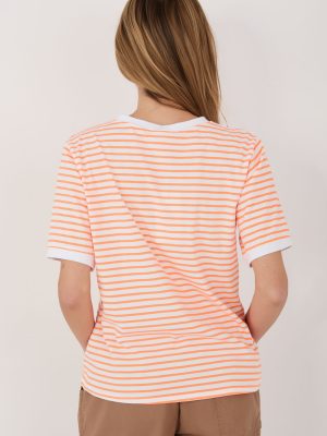 Το γυναικείο T-shirt με ρίγες είναι μια κλασική πρόταση σε casual στυλ, ιδανική για καθημερινή χρήση. Το διαχρονικό σχέδιο του δίνει έναν καθολικό χαρακτήρα, κάνοντάς το ιδανικό για πολλές εμφανίσεις, τόσο με τζιν όσο και με φούστα ή σορτσάκι. Το μοντέλο έχει κανονικό μήκος με κοντό μανίκι και στρογγυλή λαιμόκοψη, παρέχοντας άνεση και ελευθερία κινήσεων. Κατασκευασμένο από μαλακό, αεράτο βαμβάκι, είναι ευχάριστο για το δέρμα και αποδίδει εξαιρετικά κατά τη διάρκεια της καθημερινής χρήσης. Είναι ένα βασικό στοιχείο της γκαρνταρόμπας που συνδυάζει άνεση με απλή, κομψή εμφάνιση.