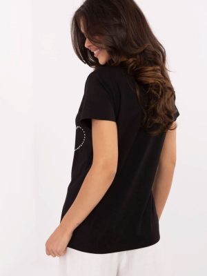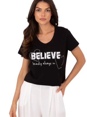Το γυναικείο t-shirt σε casual στυλ είναι η ιδανική πρόταση για καθημερινές εμφανίσεις με μια πινελιά λάμψης. Κατασκευασμένο από μαλακό και ελαστικό μείγμα βαμβακιού και ελαστάνης, προσφέρει άνεση κατά τη διάρκεια της ημέρας και τέλεια εφαρμογή στη σιλουέτα. Το μοντέλο έχει κανονικό μήκος με κοντά μανίκια και γυναικείο ντεκολτέ σε V. Στο μπροστινό μέρος υπάρχει μια εντυπωσιακή εκτύπωση με εφαρμογή, διακοσμημένη με υποδόρια ζιργκόν, που προσθέτουν στο μπλουζάκι έναν ξεχωριστό χαρακτήρα και λεπτό γυαλιστερό αποτέλεσμα. Αυτό το t-shirt είναι ο συνδυασμός άνεσης και στυλ, εξαιρετική επιλογή για κάθε μέρα, που εύκολα θα πλουτίσει κάθε casual εμφάνιση.