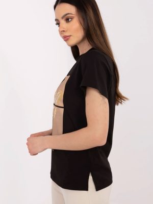 Απαλή και άνετη μπλούζα t-shirt για γυναίκες, ιδανική για καθημερινές περιστάσεις. Κατασκευασμένη από κυρίαρχο μείγμα βαμβακιού και ελαστάνης, προσφέρει άνεση κατά την φθορά και ελευθερία κινήσεων. Μοντέλο με κανονικό μήκος, κοντά μανίκια και κλασικό, στρογγυλό ντεκολτέ, ενσωματώνεται τέλεια σε casual στυλ. Η μπλούζα t-shirt διακοσμείται με εντυπωσιακή εφαρμογή, παγιέτες σχηματισμένες σε σχήμα πεταλούδας, που τραβούν την προσοχή και προσδίδουν σε όλη την εμφάνιση μια μοντέρνα αίσθηση. Το κυρίαρχο σχέδιο σε συνδυασμό με την διακριτική εκτύπωση δημιουργεί μια ενδιαφέρουσα, αλλά και καθολική εμφάνιση.