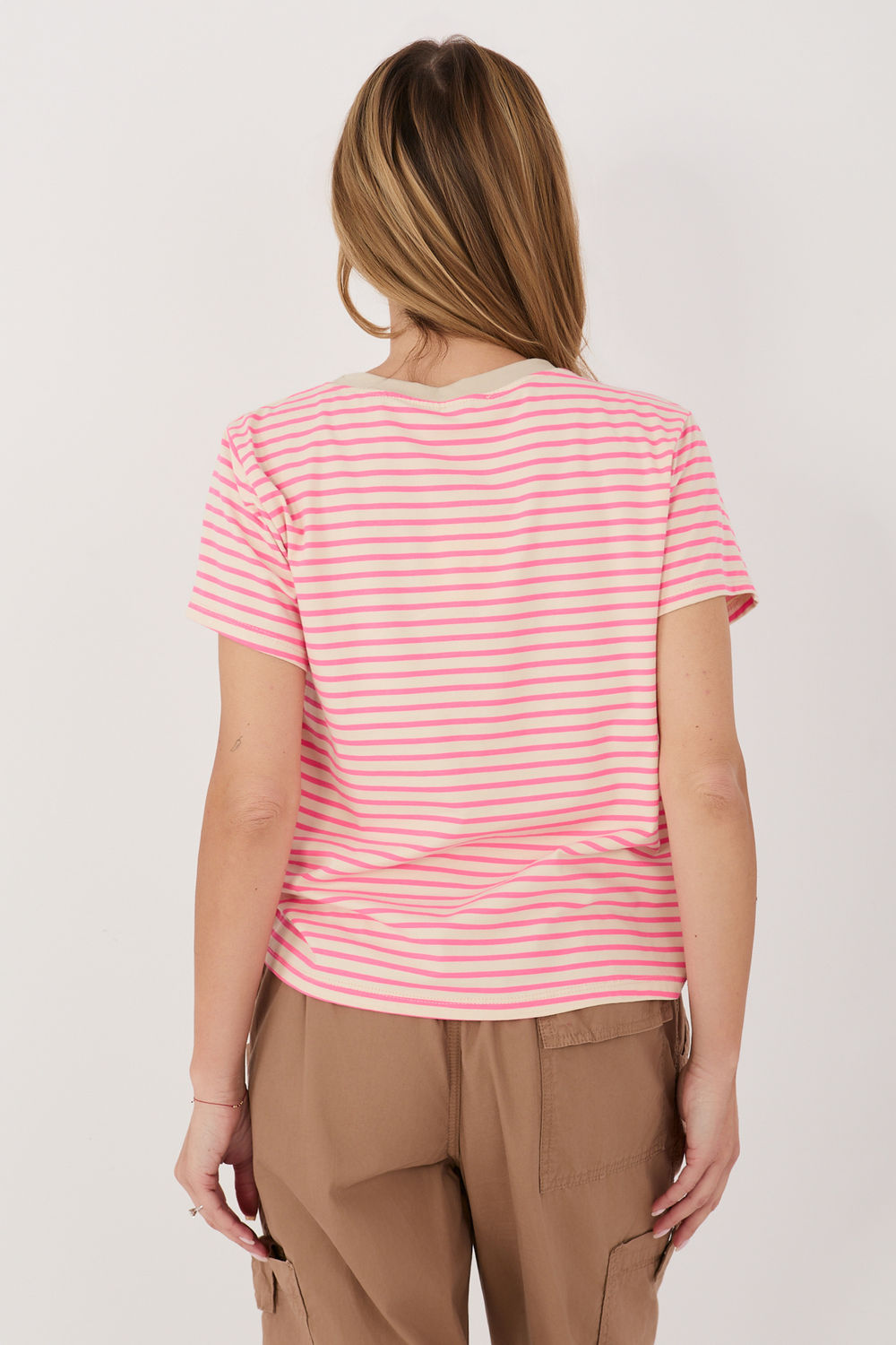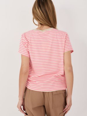 Μια στιλάτη γυναικεία μπλούζα T-shirt σε διαχρονικές ρίγες, ιδανική για καθημερινές, casual εμφανίσεις. Το κλασικό σχέδιο κάνει αυτή τη μπλούζα να ταιριάζει εξαιρετικά με τζιν, καθώς και με πιο κομψά στοιχεία της γκαρνταρόμπας. Κατασκευασμένη από υψηλής ποιότητας μείγμα βαμβακιού και ελαστάνης, προσφέρει άνεση, απαλότητα και καλή εφαρμογή στη σιλουέτα. Το κανονικό μήκος και το κοντό μανίκι την καθιστούν μια ευέλικτη επιλογή για όλες τις εποχές. Το μοντέλο διαθέτει στρογγυλή λαιμόκοψη, που αναδεικνύει τον κλασικό χαρακτήρα της μπλούζας. Συνοδεύεται από μια λεπτή, διακοσμητική κεντητή καρδιά, τοποθετημένη στην αριστερή πλευρά στο ύψος του στήθους, που προσθέτει γοητεία και γυναικεία αίσθηση.