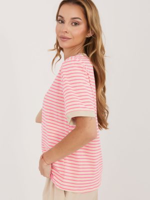 Η γυναικεία μπλούζα με ρίγες είναι μια κλασική πρόταση σε casual στυλ, ιδανική για καθημερινή χρήση. Ο διαχρονικός σχεδιασμός της της δίνει έναν καθολικό χαρακτήρα, καθιστώντας την ιδανική για πολλές στυλιστικές επιλογές, είτε με τζιν, είτε με φούστα ή σορτς. Το μοντέλο έχει κανονικό μήκος, κοντά μανίκια και στρογγυλή λαιμόκοψη, παρέχοντας άνεση και ελευθερία κινήσεων. Κατασκευασμένο από μαλακό, αεριζόμενο βαμβάκι, είναι ευχάριστο για την επιδερμίδα και αποδεικνύεται εξαιρετικό κατά την καθημερινή χρήση. Είναι ένα βασικό στοιχείο της γκαρνταρόμπας που συνδυάζει άνεση με απλή, κομψή εμφάνιση.