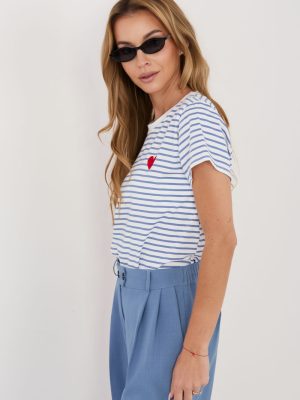 Κομψό γυναικείο T-shirt με διαχρονικές ρίγες, ιδανικό για καθημερινές, casual εμφανίσεις. Το κλασικό σχέδιο το καθιστά εξαιρετικά συμβατό τόσο με τζιν όσο και με πιο κομψά στοιχεία της γκαρνταρόμπας. Κατασκευασμένο από υψηλής ποιότητας μείγμα βαμβακιού και ελαστάνης, προσφέρει άνεση, απαλότητα και καλή εφαρμογή στη σιλουέτα. Η στάνταρ μήκος και το κοντό μανίκι το καθιστούν μια καθολική επιλογή για κάθε εποχή του χρόνου. Το μοντέλο διαθέτει στρογγυλή λαιμόκοψη που τονίζει τον κλασικό χαρακτήρα του T-shirt. Συμπληρώνεται με διακριτική, διακοσμητική κέντημα σε σχήμα καρδιάς, τοποθετημένο στην αριστερή πλευρά στο ύψος του στήθους, προσθέτοντας γοητεία και γυναικεία έμφαση.