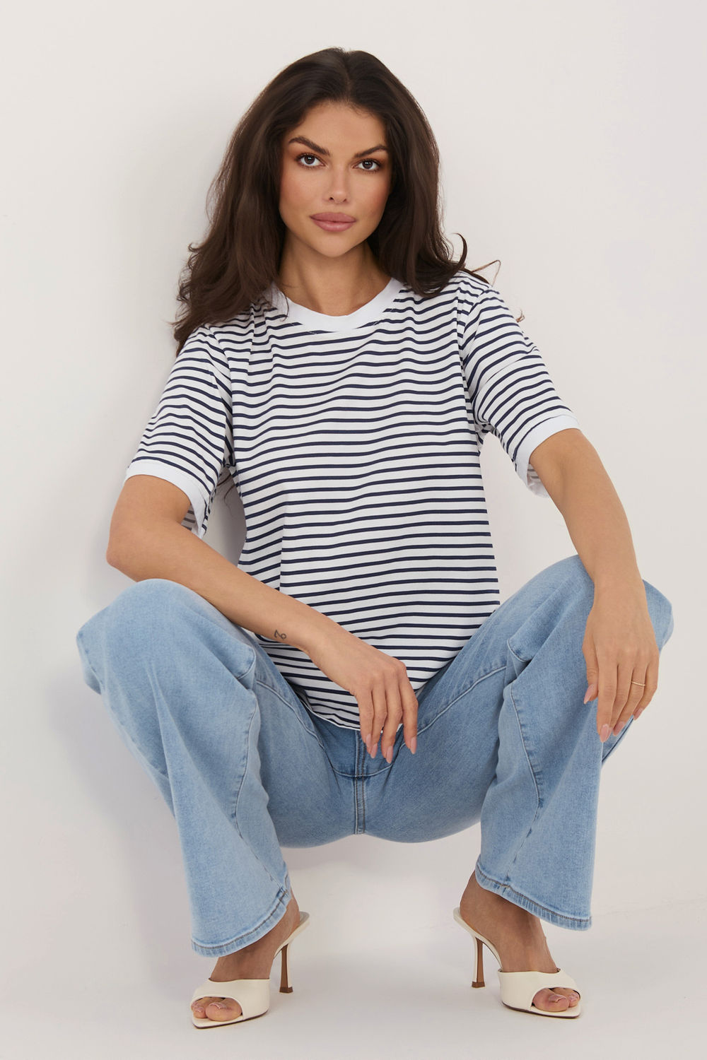 Το γυναικείο T-shirt με ρίγες είναι μια κλασική πρόταση σε casual στυλ, ιδανική για καθημερινή χρήση. Το διαχρονικό σχέδιο του προσδίδει έναν καθολικό χαρακτήρα, καθιστώντας το ιδανικό για πολλές στυλιστικές επιλογές, είτε με τζιν, είτε με φούστα ή σορτσάκι. Το μοντέλο έχει κανονικό μήκος με κοντό μανίκι και στρογγυλή λαιμόκοψη, προσφέροντας άνεση και ελευθερία κινήσεων. Κατασκευασμένο από μαλακό, αεριζόμενο βαμβάκι, είναι ευχάριστο στην επιδερμίδα και λειτουργεί εξαιρετικά κατά την καθημερινή χρήση. Είναι ένα βασικό στοιχείο της γκαρνταρόμπας που συνδυάζει άνεση με απλή, κομψή εμφάνιση.