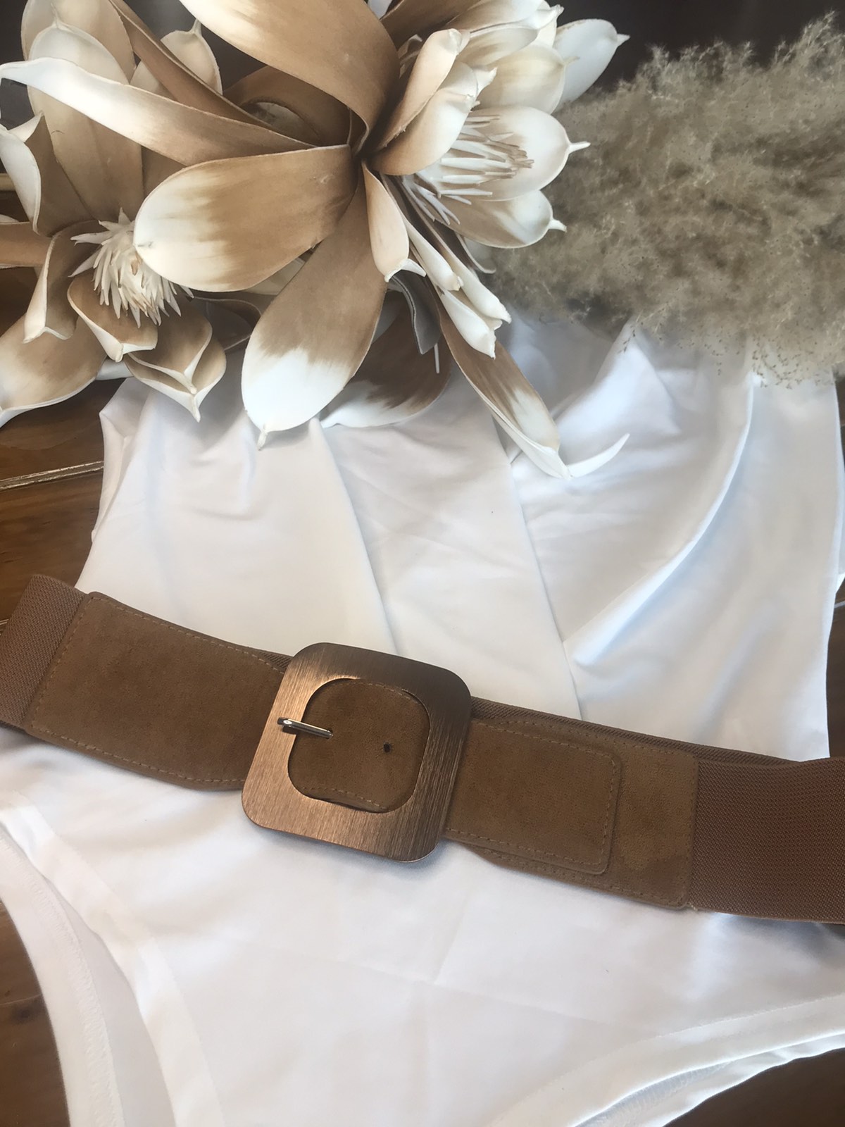 Ζώνη σε ταμπά απόχρωση, σουετ μπροστινή πλευρά, λάστιχο στο πίσω μέρος και μπρονζε μεταλλική αγκράφα.