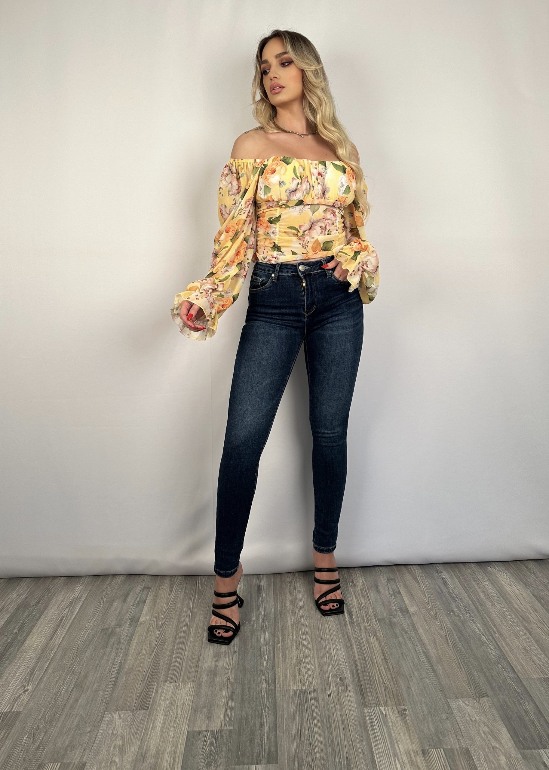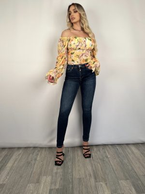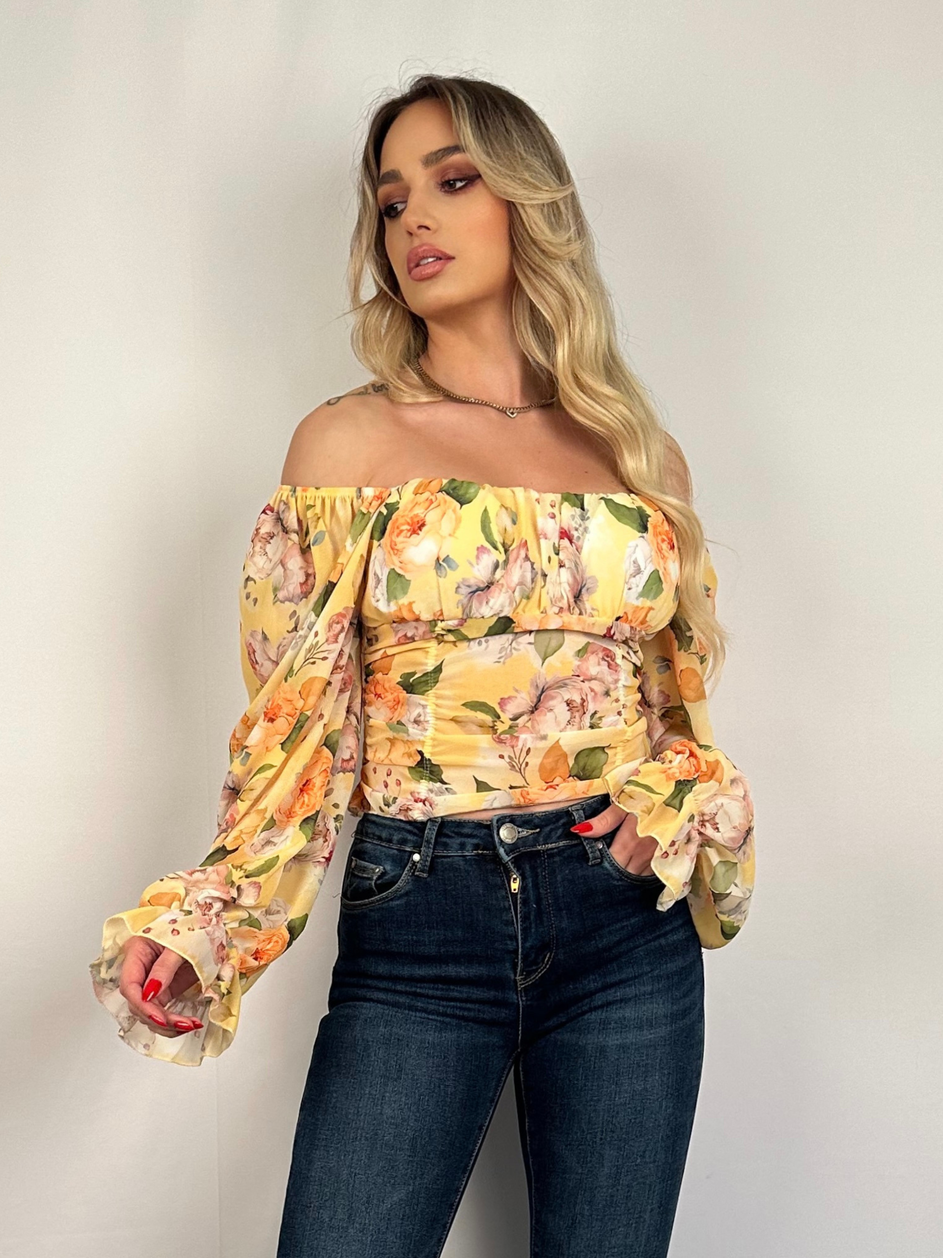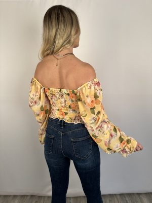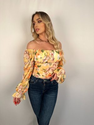 Τοπ φλοράλ σε κίτρινο χρώμα με λάστιχο στους ώμους και στο τελείωμα στα μανίκια, σφηκοφωλιά στο πίσω μέρος, cups στο στήθος