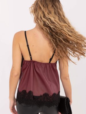Ένα κομψό γυναικείο τοπ από οικολογικό δέρμα είναι μια μόδα πρόταση ιδανική για καθημερινή χρήση και casual στυλ. Φτιαγμένο από συνδυασμό πολυεστέρα και πολυουρεθάνης, εντυπωσιάζει με την ομαλή φινίρισή του και την σύγχρονη εμφάνισή του, παραμένοντας ταυτόχρονα άνετο στην κατασκευή. Το μοντέλο έχει κανονικό μήκος και ρυθμιζόμενες τιράντες, γεγονός που διευκολύνει την προσαρμογή του στη σιλουέτα. Ο λαιμός σε σχήμα V τονίζει διακριτικά τη γραμμή του στήθους, ενώ η λεπτή δαντέλα γύρω από τον λαιμό και στο κάτω μέρος του τοπ προσθέτει μια θηλυκή, ρομαντική διάθεση. Το τοπ ελαφρώς ζεστό, είναι τέλειο για πολλές καθημερινές συνθέσεις είτε με τζιν, είτε κάτω από σακάκι ή καλοκαιρινό γιλέκο. Είναι ένα μοντέρνο στοιχείο της γκαρνταρόμπας που θα υπογραμμίσει κάθε στυλ.