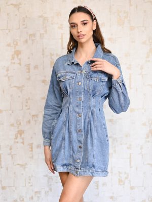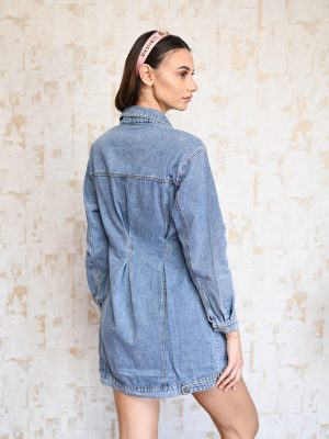 Τζιν φόρεμα, mini με κοντά μανίκια με λάστιχο στο τελείωμα, τσέπες μπροστά και πίσω και θηλάκια για ζώνη στη μέση. Κλείνει με κουμπιά στο μπροστινό μέρος.