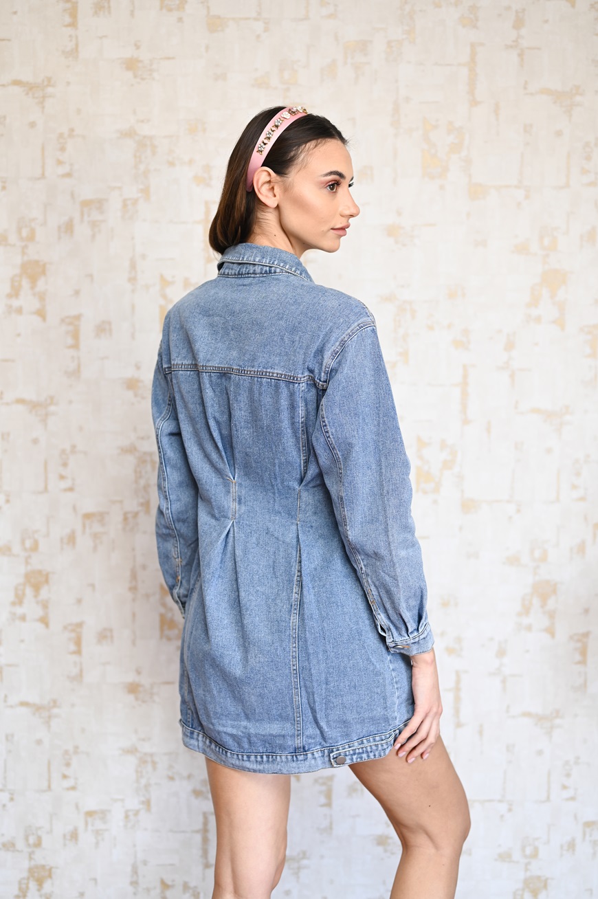 Τζιν φόρεμα, mini μεσάτο, με τσέπες στο μπροστινό μέρος. Κλείνει με κουμπιά από πάνω έως κάτω