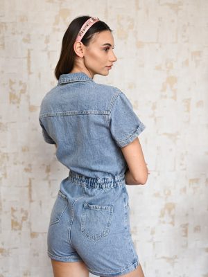 Ολόσωμο σορτς τζιν, με τσέπες μπροστά και πίσω, λάστιχο στη μέση, ρεβέρ στο κάτω μέρος. Κλείνει μπροστά με φερμουάρ.