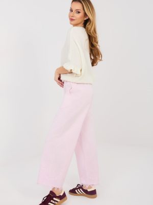 Τα γυναικεία τζιν παντελόνια τύπου wide leg είναι μια στιλάτη και άνετη πρόταση για καθημερινή χρήση, ιδανική για casual εμφάνιση. Η λείος σχεδίαση και οι φαρδιές μπατζάκια τους δίνουν μια μοντέρνα, χαλαρή αίσθηση και εξασφαλίζουν άνεση κατά την διάρκεια της ημέρας. Τα παντελόνια συνδυάζονται εξαιρετικά τόσο με κλασικά T-shirts όσο και με κομψά μπλουζάκια. Το μοντέλο είναι φτιαγμένο από υψηλής ποιότητας βαμβάκι, που εγγυάται αντοχή και άνεση κατά τη χρήση. Η ψηλή μέση τονίζει όμορφα τη μέση και διαμορφώνει τη σιλουέτα, ενώ η ελαστική ζώνη που είναι ραμμένη στο πίσω μέρος της μέσης παρέχει καλύτερη εφαρμογή και επιπλέον άνεση. Ο κλασικός μηχανισμός κλεισίματος με φερμουάρ και κουμπί, καθώς και οι πλευρικές, κρυφές τσέπες αυξάνουν τη λειτουργικότητα των παντελονιών. Η διακοσμητική δαντέλα στο κάτω μέρος των μπατζακιών προσθέτει μια διακριτική, θηλυκή νότα που ξεχωρίζει αυτό το μοντέλο από τα κλασικά τζιν.