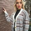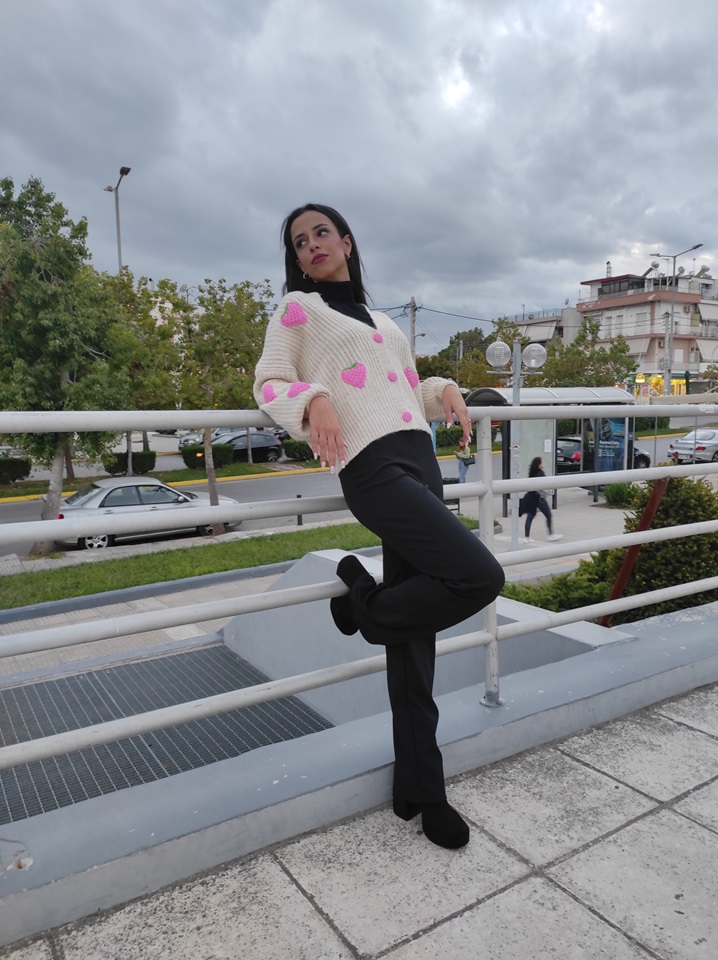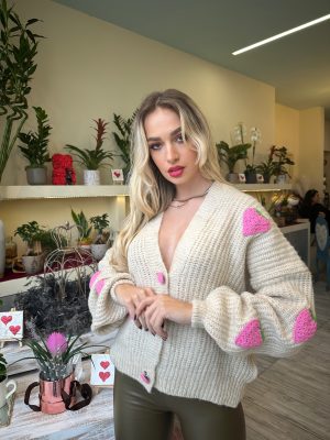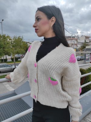 Πλεκτή ζακέτα με απλικαρισμένες πλεκτές φράουλες και ροζ κουμπιά