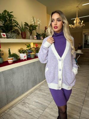 Ζακέτα πλεκτή σε λιλά χρώμα με λευκές λεπτομέρειες, σε πολύ άνετη γραμμή, με τσέπες στο μπροστινό μέρος και κουμπάκια. Δεν τσιμπάει. Καλύπτει μεγέθη από small έως και xxl
