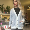 Ζακέτα πλεκτή σε μαύρο χρώμα με λευκές λεπτομέρειες, σε πολύ άνετη γραμμή, με τσέπες στο μπροστινό μέρος και κουμπάκια. Δεν τσιμπάει. Καλύπτει μεγέθη από small έως και xxl