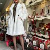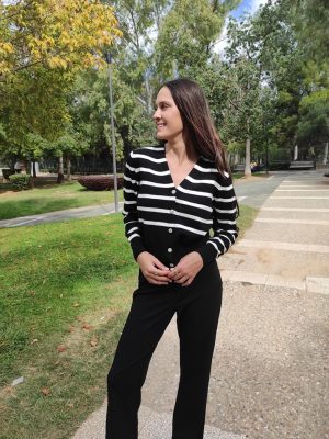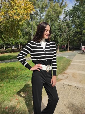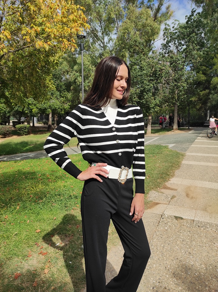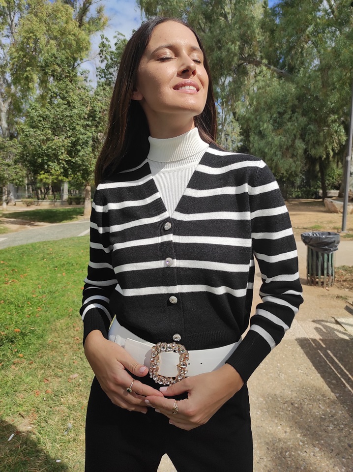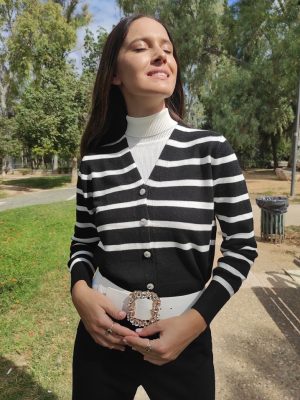 Ζακέτα με ασπρόμαυρες ρίγες, μεσαίου μήκους με v λαιμόκοψη και κουμπιά από στρας.