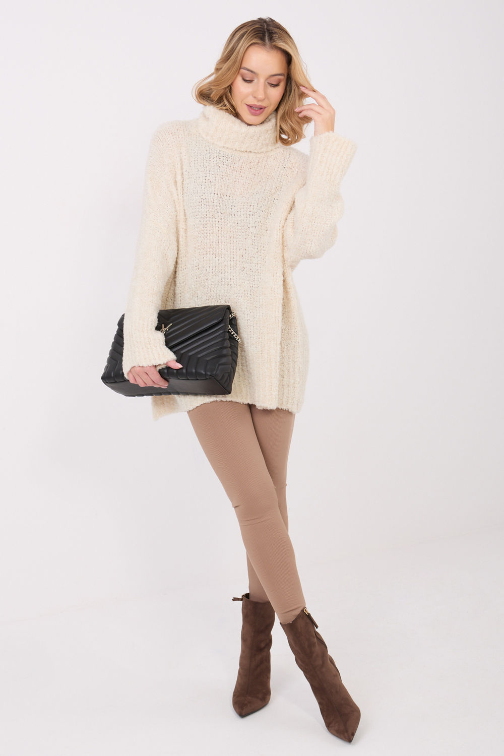 Το γυναικείο πουλόβερ από μπουκλέ με γιακά είναι μια στυλάτη και άνετη πρόταση για καθημερινές εμφανίσεις.Η χαρακτηριστική, πλεχτή υφή του υλικού του προσφέρει μια μοντέρνα, ζεστή αισθητική, ιδανική για ψυχρότερες ημέρες. Κατασκευασμένο από ένα υψηλής ποιότητας μείγμα ακρυλικού, μάλλινου, βισκόζης και πολυαμιδίου, προσφέρει ζεστασιά, απαλότητα και αντοχή. Το μοντέλο με μακριά μήκος και μακριά μανίκια αγκαλιάζει τέλεια τη σιλουέτα και εγγυάται άνεση κατά την χρήση. Ο γιακάς προστατεύει αποτελεσματικά από το κρύο, ενώ η απουσία κλεισίματος τονίζει τον απλό, casual χαρακτήρα του πουλόβερ. Το λείο σχέδιο το καθιστά ένα σύγχρονο κομμάτι της γκαρνταρόμπας, που ταιριάζει άψογα τόσο με τζιν, όσο και με κολάν ή φούστα.